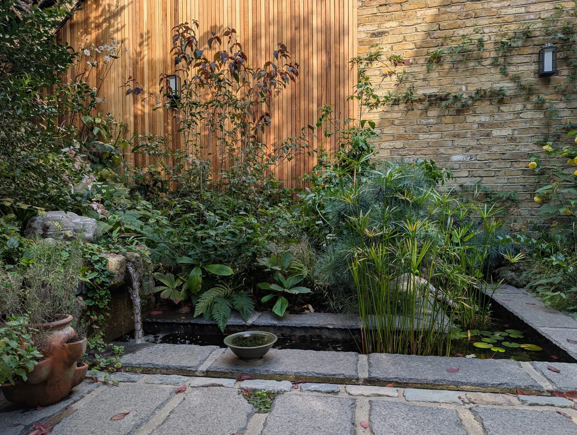 Our clients in Blackheath wanted to redesign their small garden with a tired lawn into a courtyard garden with a water feature. Inspired by Japanese planting and materials, rugged drystone walls contrast against contemporary Western Red Cedar cladding. We designed tiered beds to work with the existing sloping levels towards the back of the garden.